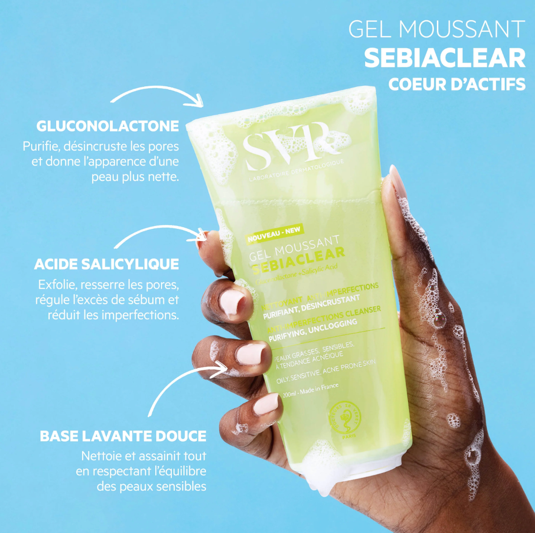 SEBIACLEAR GEL MOUSSANT is a soap-free cleanser that gently purifies and exfoliates the skin. The creamy foaming gel helps eliminate impurities and excess sebum without drying the skin. Easy to rinse off, it leaves the skin perfectly clear, fresh and mattified.