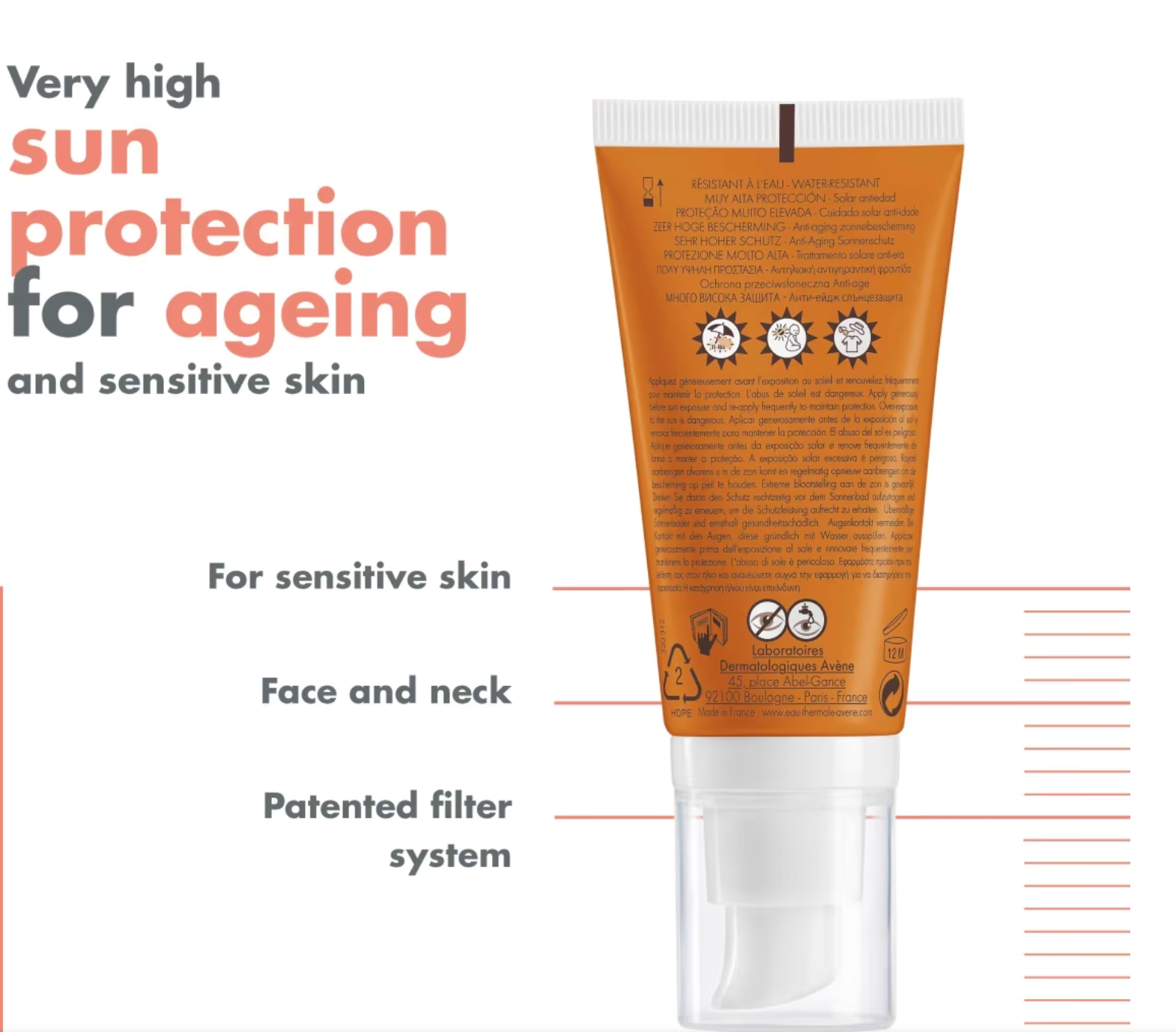 The Anti-aging suncare SPF 50+ helps prevent photoaging and is perfectly suited to all women who want to preserve the beauty of their sensitive skin.