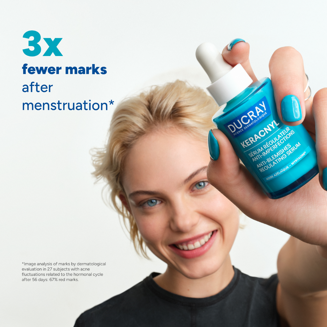 Keracnyl Anti-Blemishes Regulating Serum is a targeted treatment designed to help control acne flare-ups before, during, and after your period. Formulated to work in sync with the hormonal cycle, it helps prevent breakouts and reduce lingering post-acne marks.