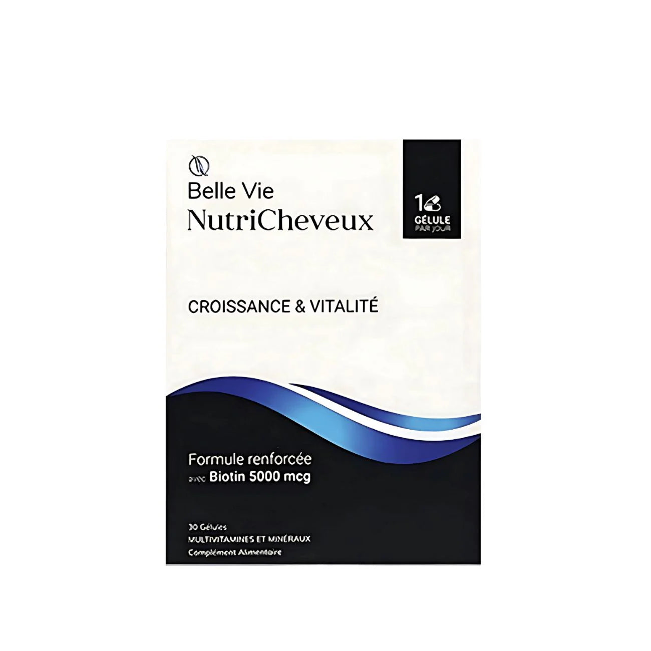 Belle Vie NutriCheveux is a multivitamin and mineral supplement formulated to strengthen hair, enhance vitality, and support healthy growth while helping reduce hair fall and improve shine. It provides a targeted blend of nutrients that compensate for deficiencies caused by stress, diet, environmental factors, or physiological changes such as postpartum or weight loss. Biotin and pantothenic acid (vitamin B5) support keratin structure to improve hair strength and resilience, while zinc and selenium offer antioxidant protection against free radicals. Collagen and silica help stimulate keratin production for denser, shinier hair, and iron supports oxygen delivery to hair roots, promoting overall hair health, smoothness, and elasticity. Together, these ingredients help maintain the hair’s suppleness, shine, and resistance, contributing to a healthier appearance and improved coverage.