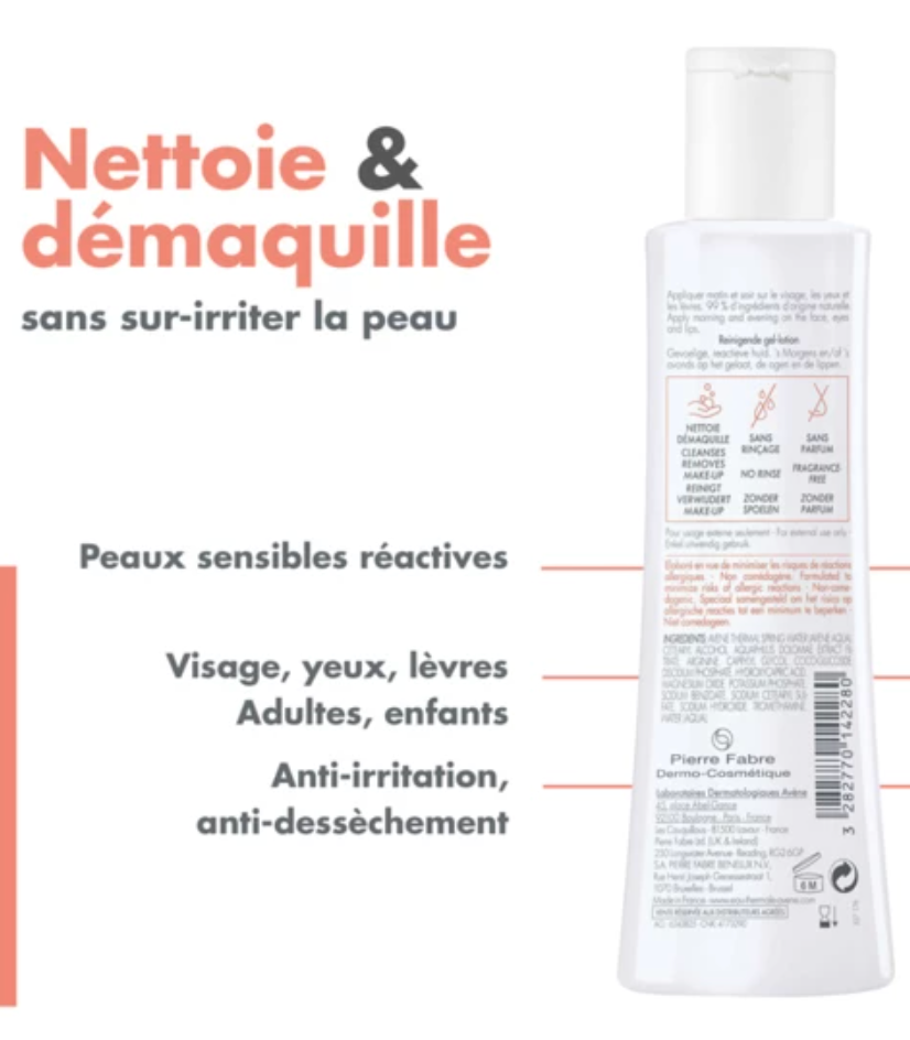 This cleansing lotion for sensitive to reactive skin gently cleanses and removes make-up from the face, eyes and lips. It eliminates the impurities accumulated during the day without over-irritating the skin or drying it out. Fragrance-free, no-rinse cleansing cleanser, its slightly gelled texture guarantees comfort and softness for the most sensitive skin.