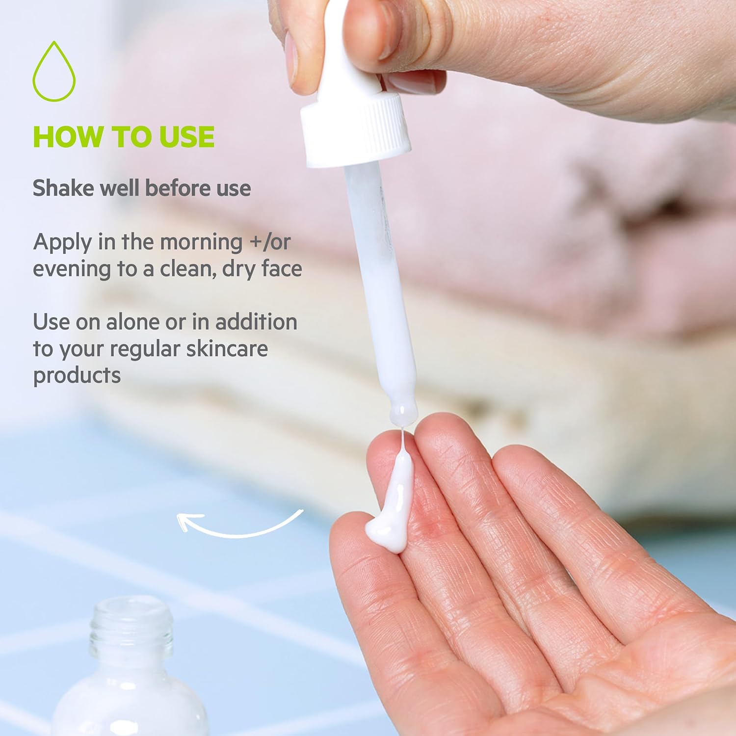 Shake before use. Apply morning and/or evening to clean, dry face. Alone or as a complement to your daily care.